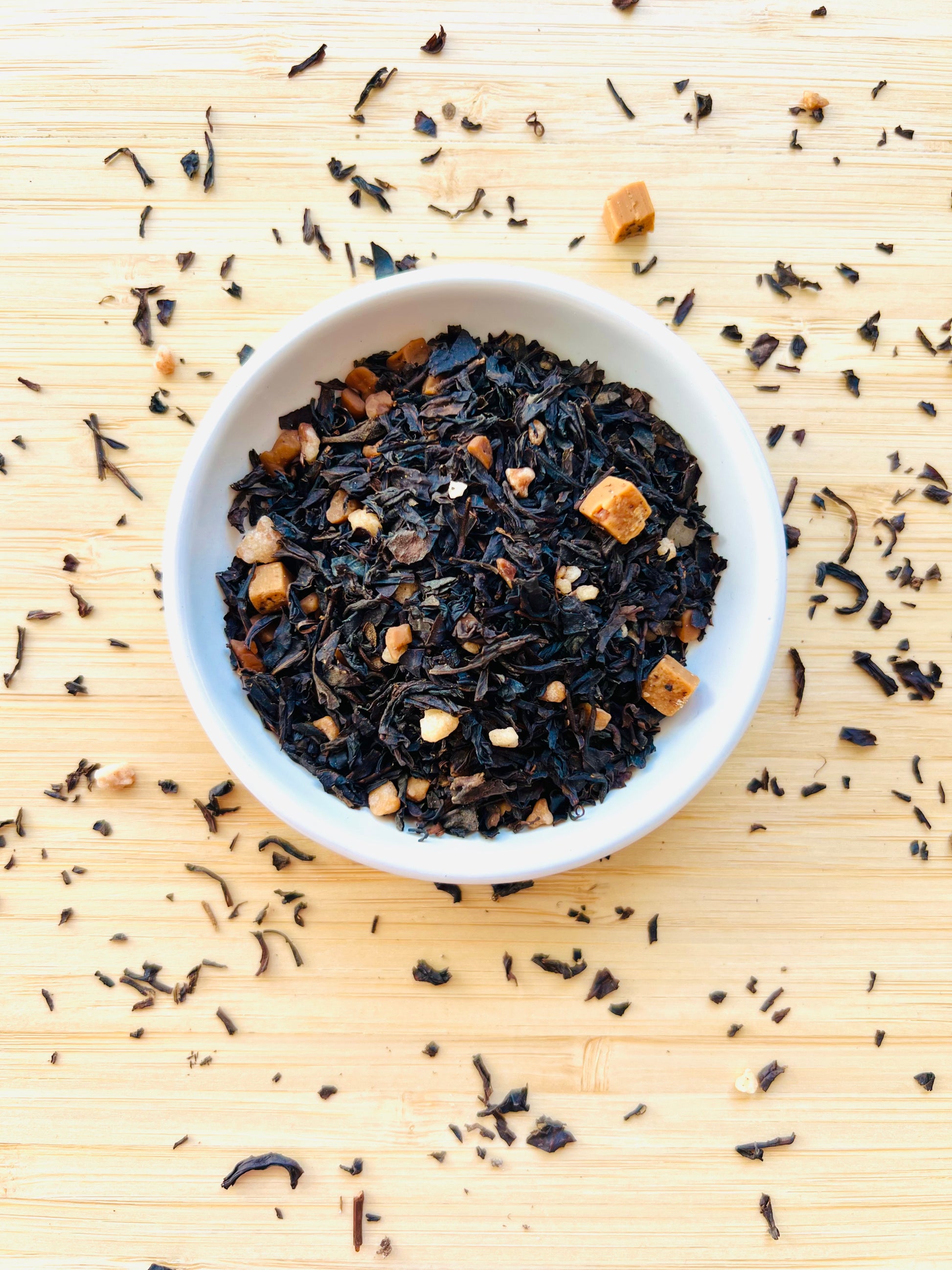 Ingredients: Black Tea, Cream-Caramel Pieces (Sweetened Condensed Skimmed Milk, Sugar, Glucose, Molasses, Butter Fat, Wetting Agent: Sorbitol, Emulsifying Agent: Mono- and Diglyceride of Edible Fatty Acids), Planed Almonds, Brittle Pieces (Sugar, Hazelnuts, Invert Sugar), Pearl Salt, Flavoring